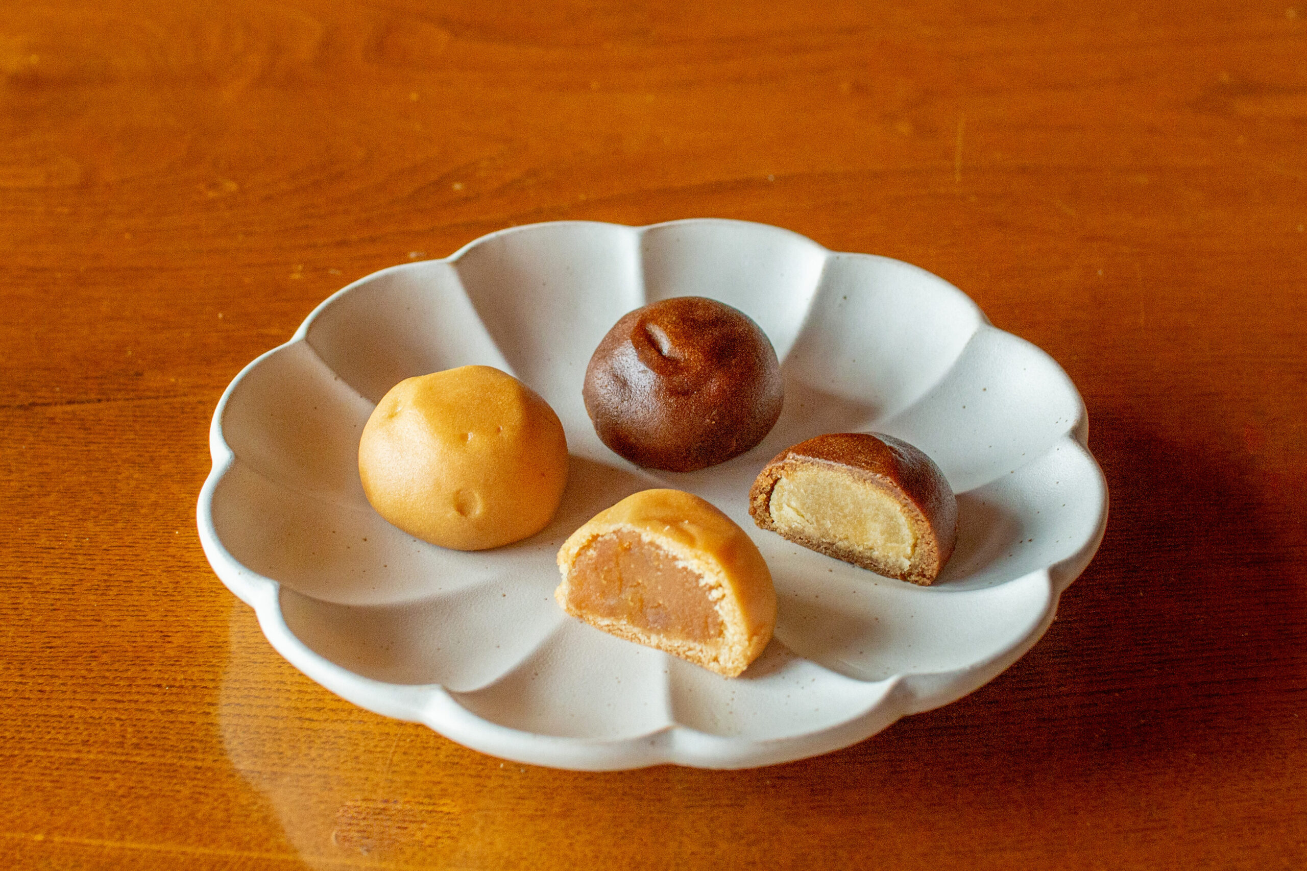 ーロサイズ2個入り一包みのお菓子です。ミルク入りの黄身餡をコーヒー味の皮で包んだものと、ミルクとりんご入りの黄身餡の2種類の焼き菓子です。